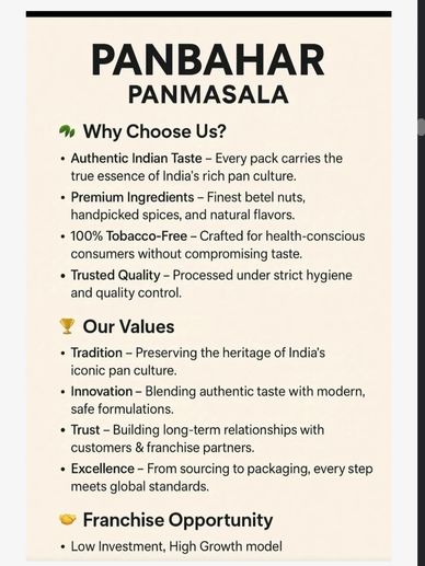 Our team of professionals offers a range of services to support your business, including legal, accounting, and marketing services. With our help, you can take your business to the next level.www.panbaharpanmasala.com expands worldwide, our products and name are used worldwide, but we are proud to say that it was born in India from www.panbaharpanmasala.com